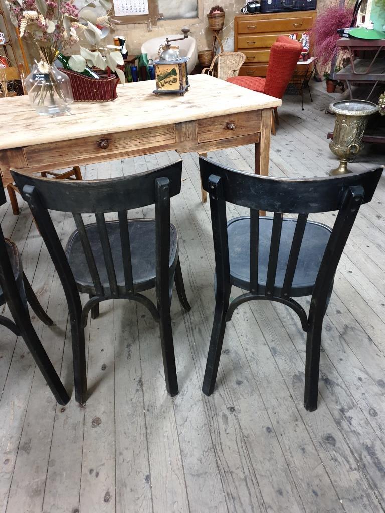 Chaises Bistrot Noires | Le dossier et l'assise ont été rénovés et peints couleur noir mat puis vernis. Une chaise style bistrot authentique et confortable pour une ambiance paisible. Le lot de 4 chaises de terrasse bistrot est garanti 2 ans. Peinture d'origine, légers manques par endroit. Les chaises bistrot reviennent à la mode.